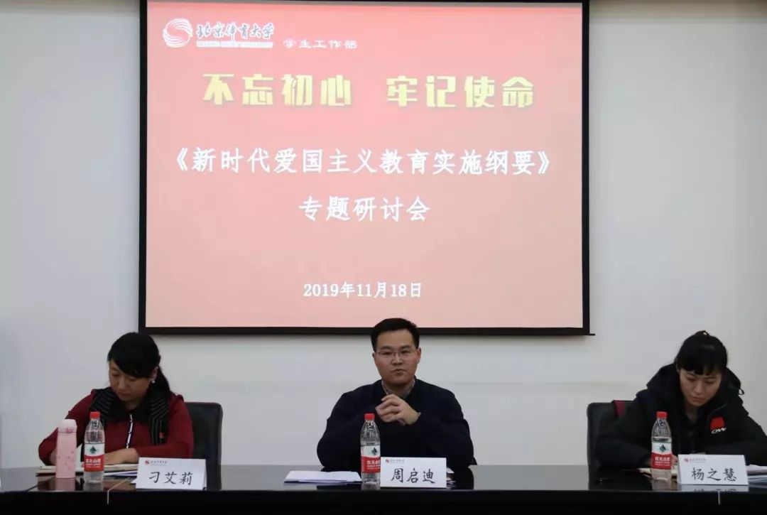 会议最后,学生工作部部长周启迪表示,要认真学习《纲要》,从讲政治的高度充分认识新时代高等院校开展爱国主义教育的目标和重要性;要认真对标《纲要》,进一步明确爱国主义教育包含的丰富内容和实践载体,切实提升辅导员队伍开展爱国主义教育的能力;要切实落实《纲要》要求,要把习近平总书记给我校2016级研究生冠军班的回信精神、把我校师生参与新中国成立70周年庆典活动激发的强烈爱国热情转化为全校师生奋进新时代的不竭动力,真正做到为体育强国建设多作贡献,为社会传递更多正能量。